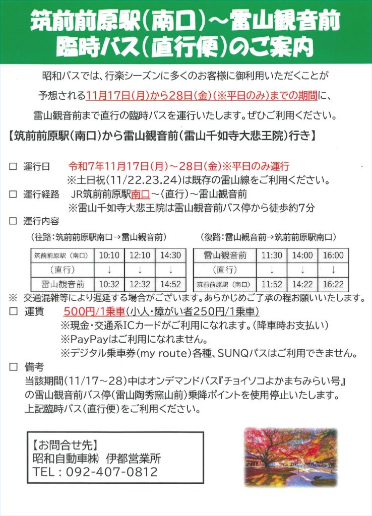 ※臨時バス運行日は、オンデマンドバス「チョイソコよかまちみらい号」の雷山観音前バス亭(雷山陶秀窯山前)乗降ポイントは使用停止されます。臨時バス(直行便)をご利用ください。