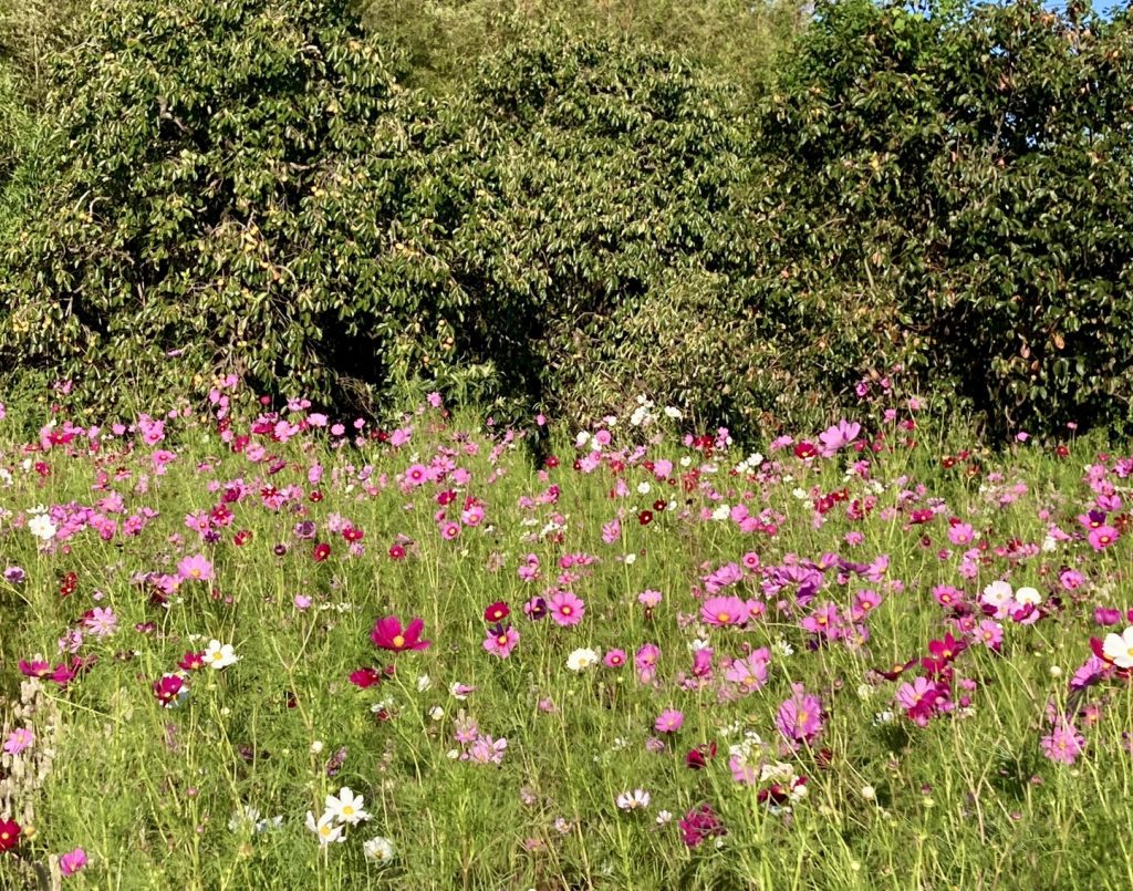 原っぱにレジャーシートを敷いて、さわやかな秋風を感じながらのんびりコスモス鑑賞いかがですか。