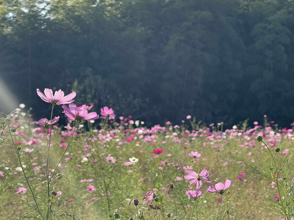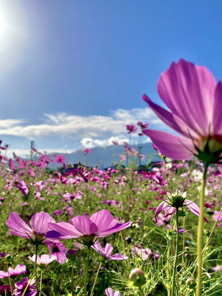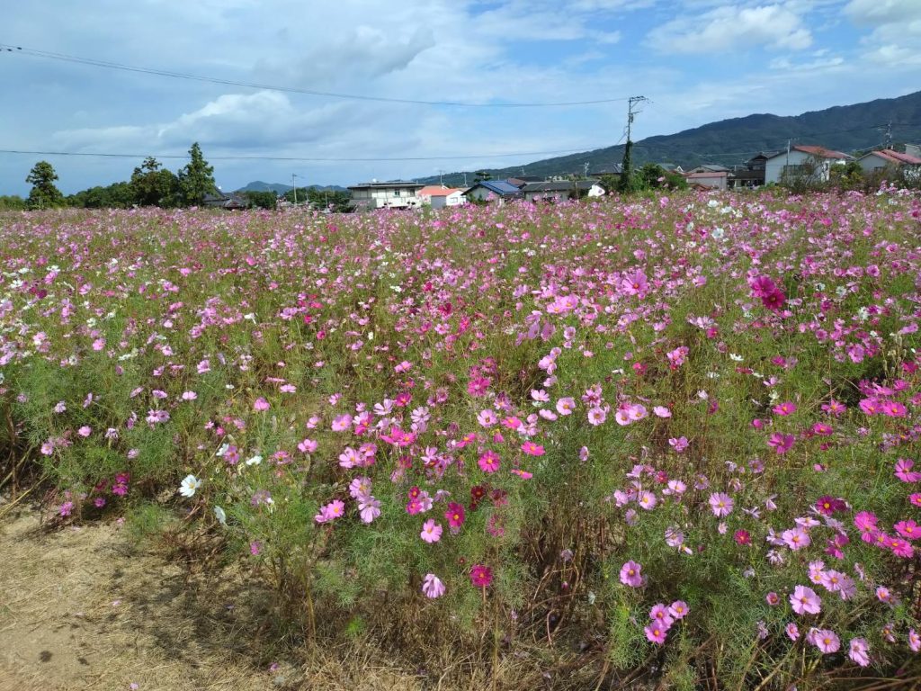 秋になると、地元の方々がみなさんに楽しんでもらおうと、周辺の田畑にコスモス畑を作られます。コスモスの見頃は、例年10月中旬から下旬あたりです。