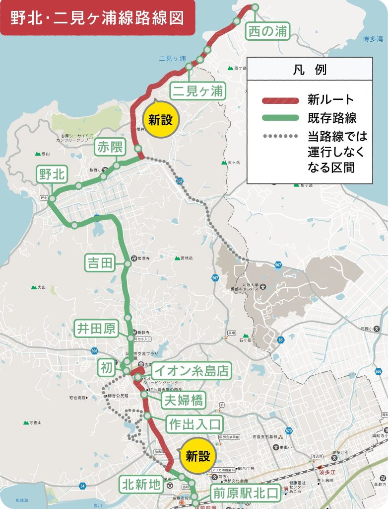 ●野北線は、「北新地」から県道506号バイパスを通り「イオン糸島店」に停車し、「赤隈」からは、「二見ヶ浦」、「西の浦」に停車するルートになり、名称が野北・二見ヶ浦線に変わります。