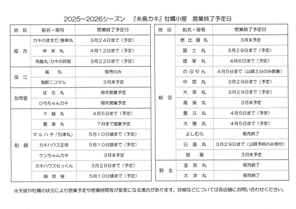 2025年度のJF糸島所属の牡蠣小屋(カキ小屋)の営業終了予定日情報です。
