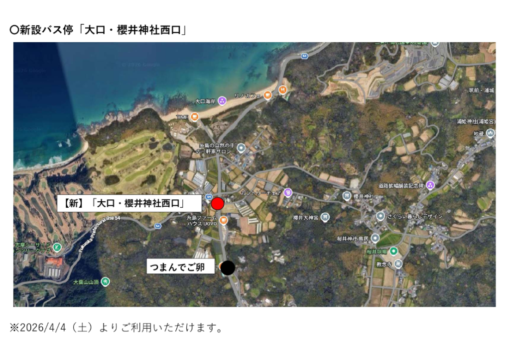 「つまんでご卵」〜「二見ヶ浦・月と太陽糸島茶房前」の間に、新たにバス停が設置されます。櫻井神社方面へのアクセスが便利になります。